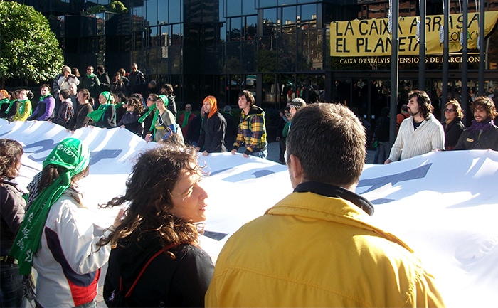 La Caixa arrasa el planeta, Justicia social y ambiental y Allibera’t de la banca. Estos tres mensajes colgados de la fachada de la sede central de CaixaBank en Barcelona un día de diciembre de 2011 les pueden costar a ocho activistas de Ecologistas en Acción ocho meses de cárcel y 2.400 euros a cada uno. La acción no violenta tuvo lugar en el marco del Congreso Confederal de la organización ecologista. La idea era denunciar «la enorme acumulación de poder político y económico en el sector bancario», así como la «responsabilidad directa que tiene esta entidad financiera con la situación española actual y la destrucción del medio ambiente global».