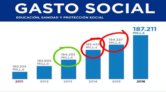 La clave es que esa categoría no incluye ni Educación ni Sanidad. Para englobar las tres patas, sería necesario dar un dato muy distinto, el de «Gasto social». La evolución de esa partida, que es sobre el que la PP realiza el gráfico -así titula- es bien distinta: gracias a los recortes en Educación y Sanidad, el Gasto social ha bajado. En concreto, de los 296.481 millones de euros de 2011 -año gobernado casi en su totalidad por el PSOE- ha pasado a 289.080 millones en 2014 (un 2,5% de recorte, sin ajustar la inflación).