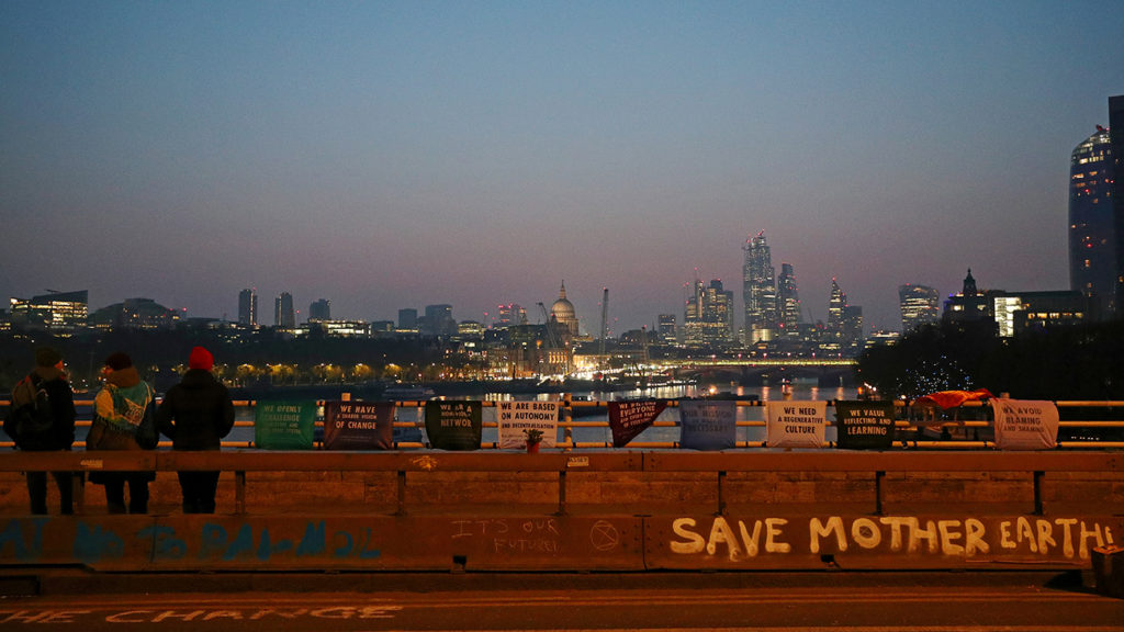 Activistas bloquean parte del puente de Waterloo durante la protesta de Extinction Rebellion. REUTERS / Hannah McKay