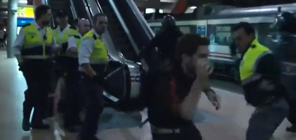MADRID // Un vídeo grabado en un andén de tren de Atocha muestra cómo vigilantes de seguridad de la estación golpean con sus porras a varios jóvenes, tras la intervención de los antidisturbios. En la secuencia, de 17 segundos, se ve cómo los policías abandonan el andén por las escaleras mecánicas. Pese a la retirada, es entonces cuando uno de los vigilantes se encara con un joven [ver vídeo]: