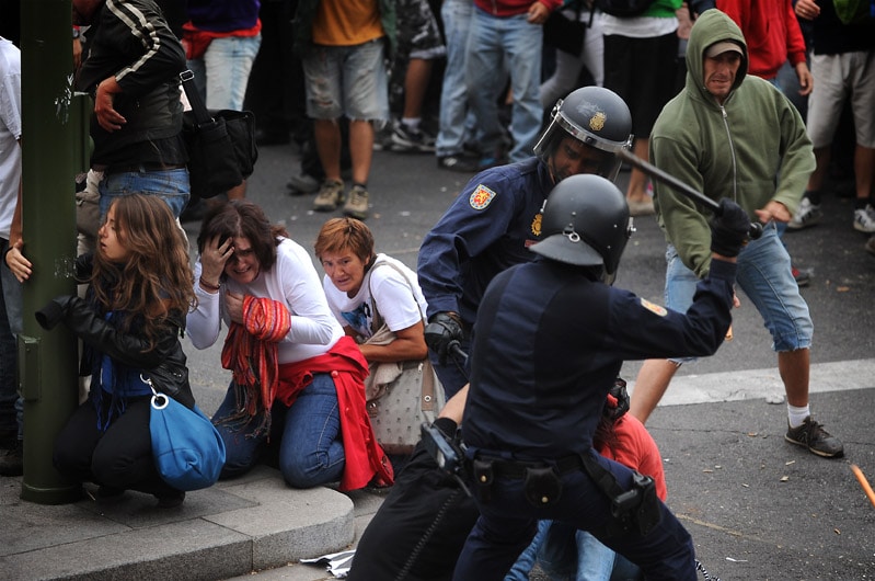 También se evitaría que, como ocurrió en la manifestación a la que aludimos -la que se saldó con una carga policial que persiguió a los concurrentes por los bares de la zona y hasta los mismos andenes de la estación de Atocha-, los espectadores se preguntaran por la identidad de los jóvenes enmascarados que, enarbolando unas peculiares banderolas rojas y negras en la primera línea de las vallas instaladas ante el Congreso, pudieron propiciar de algún modo la intervención de los antidisturbios.