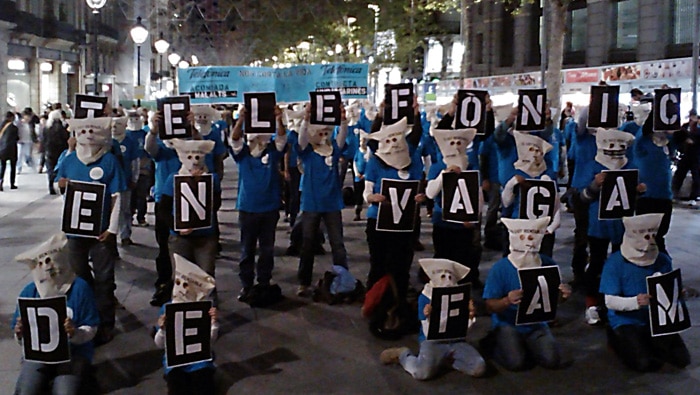 A las cinco de la tarde, un centenar de empleados de la compañía y sus familias han llevado a cabo una flashmob en el Portal del Ángel de Barcelona. Con la cara cubierta por un saco con la inscripción “Sí, soy rentable”, han desplegado unas cartulinas en las que se podía leer “Telefónicos en huelga de hambre”. Posteriormente se han desplazado hasta el edificio de la compañía en la calle Marqués de Campo Sagrado, donde iniciarán la huelga.