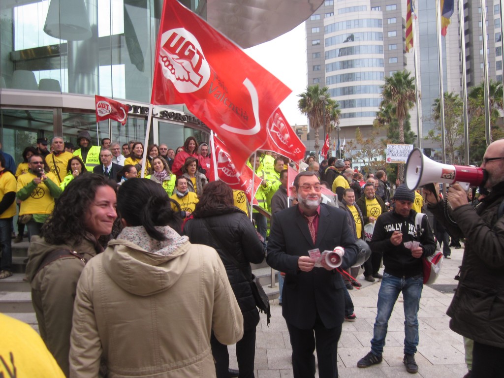 VALENCIA // Pitos, cacerolada y muchas protestas. Con este arsenal han recibido esta mañana al presidente Mariano Rajoy en Valencia, donde ha acudido para asistir a un acto empresarial. Víctimas de los Expedientes de Regulación de Empleo (ERE) de empresas públicas como Ferrocarrils de la Generalitat Valenciana (FGV) o Radio Televisión Valenciana (RTVV), compartían protestan con colectivos que no han cobrado de la administración, representantes de médicos, miembros de la Plataforma de Afectados por los Desahucios, dependientes y con los sindicatos que aprovechaban para convocar a las manifestaciones de mañana, entre muchos otros.