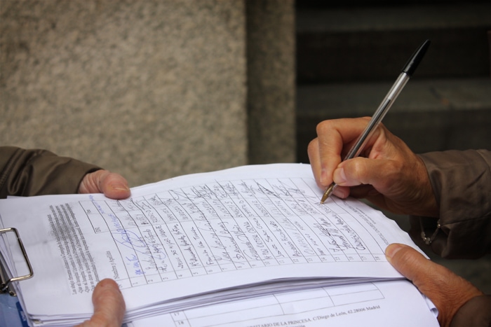 Una vez aprobado el texto se tendrá un plazo de nueve meses para recoger el medio millón de firmas. Estas firmas deberán presentarse en unos folios donde constarán algunos datos como el DNI, nombre completo o domicilio. También se podrá pedir la firma de forma telemática, con la certificación digital, pero en cualquier caso únicamente podrán firmar personas inscritas en el censo electoral, lo que excluye a inmigrantes y menores de 18 años. La lista tendrá que ser refrendada por los fedetarios, personas de la campaña que dan fe de la autenticidad de las firmas.