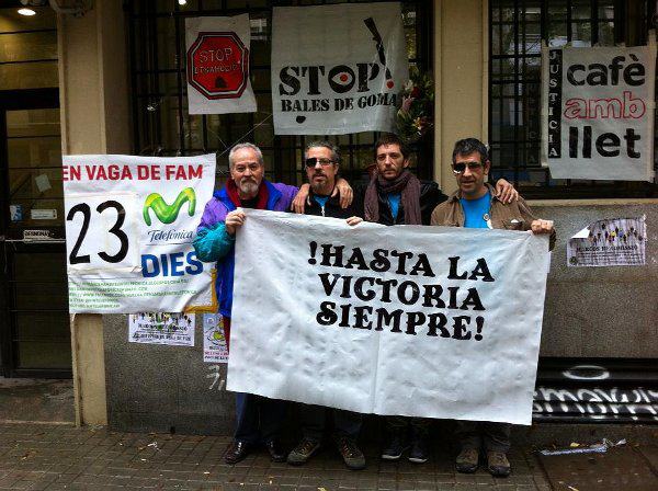 BARCELONA // Tras 23 días sin comer, los cuatro trabajadores de Telefónica en huelga de hambre decidieron ayer seguir el consejo de los médicos y abandonar el ayuno. La protesta que se inició para pedir la readmisión de Marcos Andrés Armenteros, despedido de forma improcedente tras bajas médicas justificadas, ya obligó la semana pasada a dejar la huelga a uno de los cinco huelguistas, Josep Bel, que tuvo que ser ingresado. Los trabajadores han constatado que, si bien Marcos no ha sido readmitido, han conseguido triunfos: romper el silencio mediático, unir a su lucha laboral a los movimientos sociales e incomodar a una multinacional intocable.