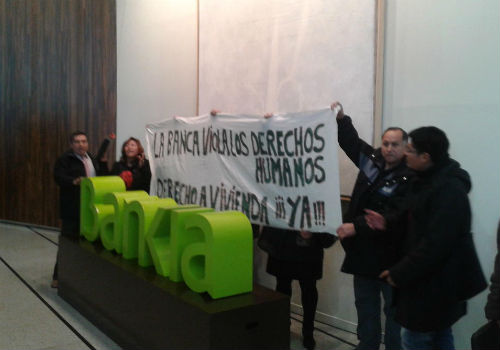 Más de una veintena de activistas y afectador por ejecuciones hipotecarias han decidido llevar sus exigencias al "lugar donde se toman las decisiones" en el banco de la capital