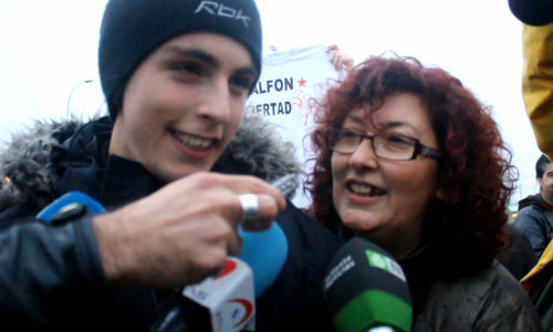 Y entonces, sobre las 18:00 horas, Alfon salió, sonriente, y comenzó a abrazar a sus seres queridos: su madre, su padre, su abuela, su hermana. Su novia no había podido llegar a tiempo debido al control de la Guardia Civil. Mientras, decenas de amigos y conocidos del joven rugían: “Liberado, Alfon liberado”, “Cifuentes, escucha, Madrid está en la lucha” y otras consignas.