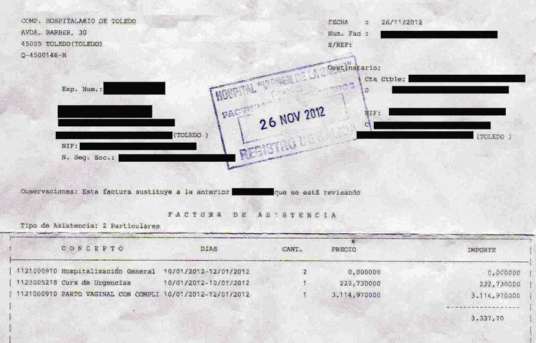 El documento registra la fecha de ingreso de la paciente el 10 de enero de 2012, con alta dos días después. En la factura, expedida por el Hospital Virgen de la Salud, se recogen tres conceptos: hospitalización general (gratuita), cura de urgencias (222,73 euros) y parto vaginal con complicaciones (3.114,97 euros). Total: 3.337,70 euros por dar a luz en uno de los hospitales públicos de Toledo.