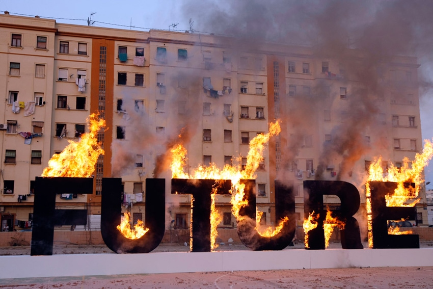Las imágenes muestran una Valencia decadente, nada que ver con las exposiciones de hace años con políticos exultantes. Ahora, se ven desahucios, manifestaciones, protestas… todo resumido en una instantánea de la ciudad en penumbra, oscura, bajo las cenizas de los incendios del verano pasado.