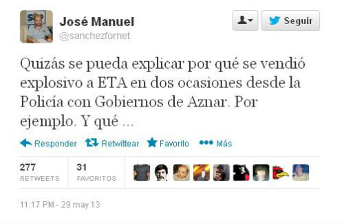 Pero esta acusación no fue la única. El policía pintó en Twitter un panorama de prácticas que podrían ser delictivas en la lucha antiterrorista en el que salen mal parados los ejecutivos del PSOE, los del PP y también el jefe del Estado, Juan Carlos I.