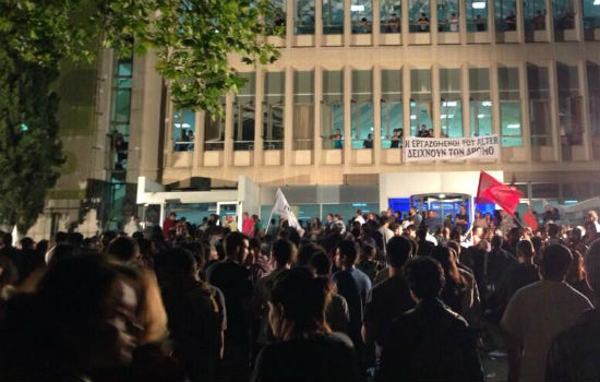 El Gobierno griego ha anunciado de manera inesperada este martes el cierre de la cadena pública helena, ERT. Sin embargo, sus periodistas no se han rendido y han permanecido toda la noche en la sede central de la emisora, mientras miles de personas se han concentrado en los alrededores entonando los cánticos que se cantaban contra la dictadura en los 70 (aquí puedes ver un vídeo subido por un manifestante).