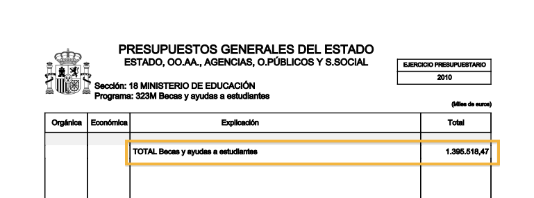 En el año 2010 el gasto presupuestado en becas fue de 1.395 millones de euros.
