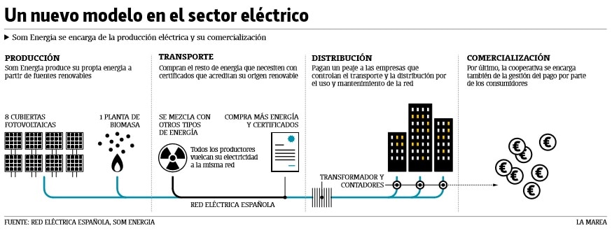 Tan sólo en las fases de producción y comercialización existe competencia entre empresas, y éstas son las áreas en las cuales actúa Som Energia, que se ve obligada al pago de un peaje a las grandes compañías que controlan el transporte (Red Eléctrica Española) y la distribución, por el uso de la red.