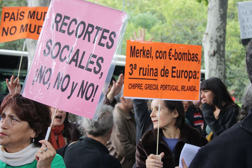 Casi todos los manifestantes coincidían en señalar que el origen de los recortes se encuentra en el uso de dinero público para satisfacer la deuda que el rescate bancario ha traído consigo. Entre ellos Marta Hidalgo, que ha actuado de portavoz de un grupo de pensionistas que ha acudido a la protesta. “Nos están recortando en educación, en sanidad y en salarios, y todavía se ufanan de que estamos saliendo de la crisis. Estarán saliendo los que ganan mucho dinero a costa del sufrimiento de la mayoría. Para los ricos es salir de la crisis, para el pueblo es la ruina“.