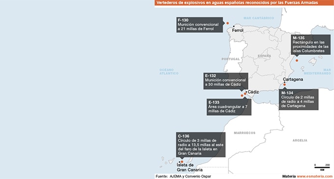 “La munición existente en esos puntos es munición convencional en general y no podemos dar información precisa acerca de la cantidad”, aseguran desde el gabinete del almirante general. Se trataría de miles de toneladas de obuses, minas, granadas y munición de armas ligeras, entre otros tipos de material de guerra, si se extrapola a partir de los vertidos conocidos en países vecinos. En 1994, por ejemplo, Portugal hundió un buque cargado con 2.000 toneladas de munición caducada a menos de 350 kilómetros de su costa.