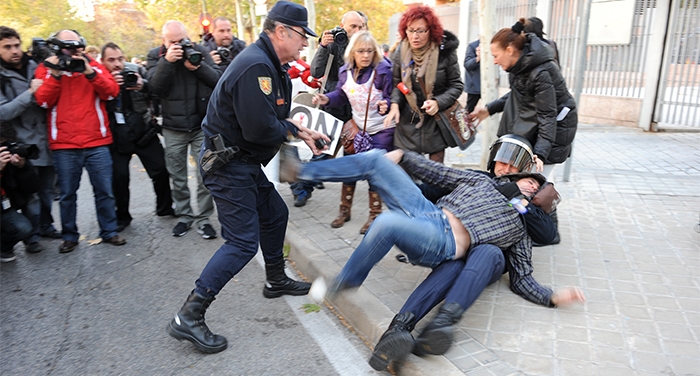 • El “acoso policial a la prensa y los fotoperiodistas en las protestas ciudadanas”: El informe asegura que los cuerpos de seguridad del Estado dificultaron la actuación de los periodistas, y en especial la de los reporteros gráficos, en la cobertura de manifestaciones, desahucios y escraches. Los impedimentos más frecuentes fueron “relegar a los reporteros a posiciones alejadas, rechazar sus credenciales, exigir a los freelance un chaleco identificativo (que no es obligatorio) y, en ocasiones, incluso se llegaron a efectuar cargas contra ellos”. RSF destaca los casos particulares de varias detenciones a periodistas por cubrir protestas sociales (Raúl Capín, Adolfo Luján, Edu León y Francisco Gómez) y las agresiones por parte de los escoltas de la reina Sofía y la ministra Ana Mato a la periodista de Antena 3 Soledad Arroyo