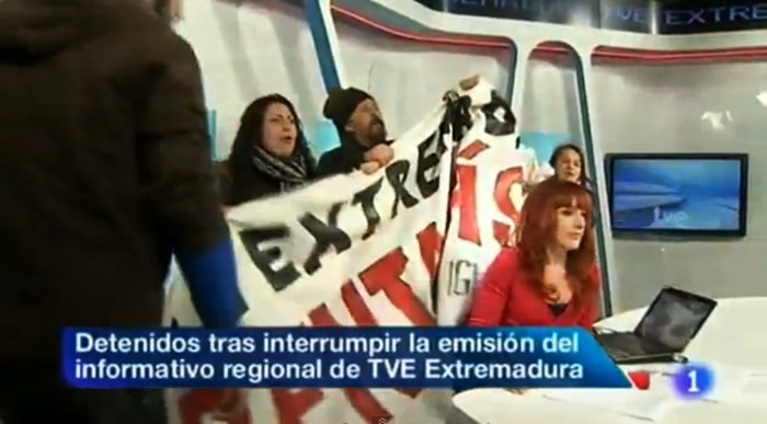 Este martes, cerca de 30 personas, la mayoría miembros del Campamento Dignidad de Mérida, entraron en los estudios de TVE en la capital extremeña. «Entramos sin problema alguno. El guardia de seguridad vio a tanta gente acercarse que decidió no actuar y, simplemente, llamó a la Policía», relatan fuentes del colectivo.