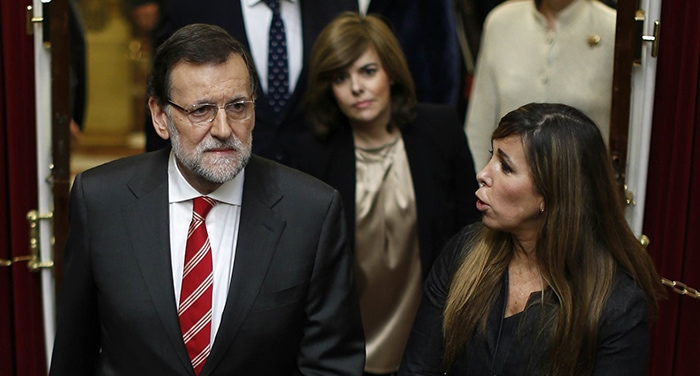 16.03: Entra Rajoy al Hemiciclo escoltado por la vicepresidenta Soraya Sáenz de Santamaría y la líder del PP catalán, Alicia Sánchez Camacho.