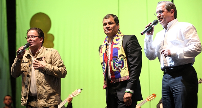 Eran cerca de las 21.00 horas cuando los presentadores del acto anunciaron que Correa estaba entrando en el edificio. Mientras sonaba el himno de Ecuador, la pantalla gigante ofrecía las imágenes del presidente saludando a quienes lo esperaban en la puerta y avanzando a duras penas entre vítores, besos y abrazos de los ecuatorianos que habían ido a escucharlo, en una puesta en escena que recordaba mucho a las de los candidatos estadounidenses a la presidencia en campaña electoral o a la de la entrada de las estrellas de Hollywood a la gala de los Óscar. Antes de que subiera al escenario, fueron el embajador de Ecuador en España, Miguel Calahorrano, y el ministro de Relaciones Exteriores y Movilidad Humana, Ricardo Patiño, los encargados de darle la bienvenida y pronunciar el discurso introductorio respectivamente.