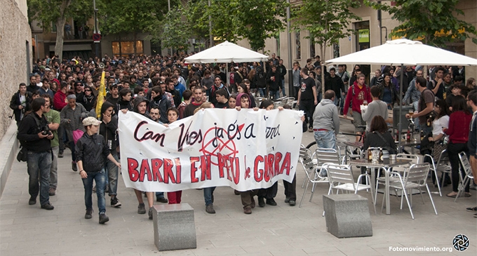 Tampoco se cerraron ayer las estaciones de metro de Plaça de Sants y Hostafrancs, como había sucedido las noches anteriores. Pasadas las 23 horas, dos horas después del inicio de la protesta, y cuando gran parte de los manifestantes abandonaban la concentración, algunos encapuchados iniciaron los disturbios quemando un primer contenedor y apedreando una sucursal del Banco Popular, mientras una vecina se lo recriminaba desde el balcón. Los Mossos d’Esquadra activaron el cañón de sonido y algunos jóvenes comenzaron a llamar al timbre de los vecinos que viven sobre la sucursal bancaria para avisarlos del fuego que comenzó a quemar en el interior del banco. Tras veinte minutos de avisos y de lanzamiento de piedras a los policías comenzaba una carga policial que se saldó pasada una hora con 23 detenidos. Uno de los ocupantes habituales del inmueble, que eludía dar su nombre, explicaba ayer a la agencia Efe que «los actos violentos los provocan grupos de rebeldes encapuchados que no son de Can Vies».