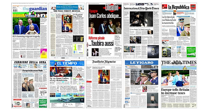 La abdicación del rey y las posteriores manifestaciones republicanas aparecen en los principales diarios internacionales. Le Monde, la BBC, Al Arabian News y The New York Times son algunos de ellos