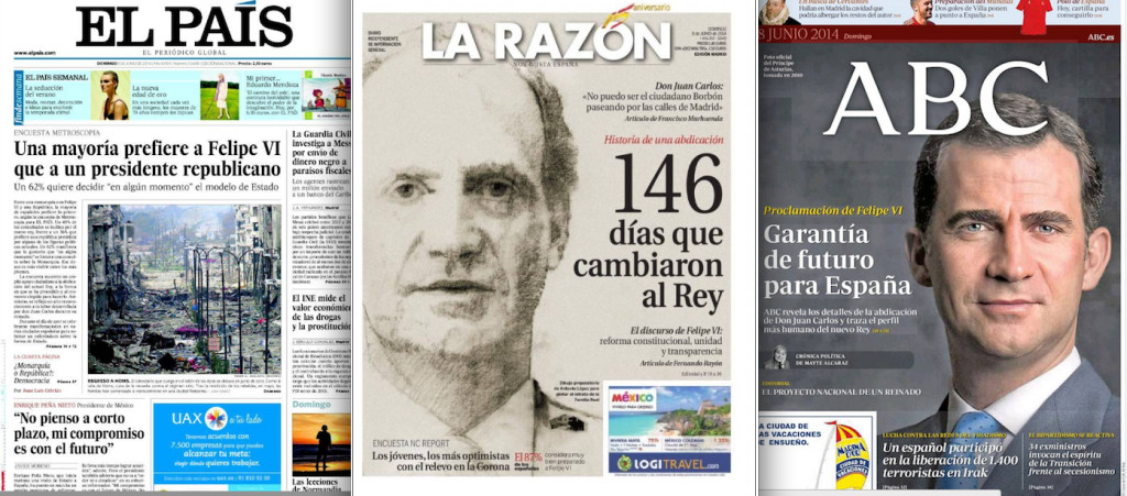 Las portadas del diario ABC y El País del día 4 de junio fueron un perfecto ejemplo de esa coordinación de la prensa. Los dos diarios monárquicos llevaron la misma portada mostrando el apoyo que la Monarquía recibirá en las Cortes. El titular de El País fue: Felipe VI será rey en quince días con el 90% de apoyo de las Cortes. Por otro lado, el diario ABC titulaba así: La Monarquía recibirá el apoyo del 90% del Congreso.