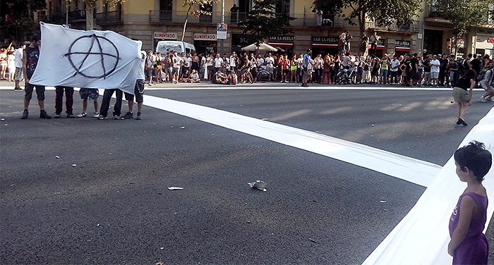 BARCELONA // La Barcelona libertaria ha respondido a la llamada. Lo que comenzó como una convocatoria jocosa para hackear la V soberanista de la Diada finalmente se ha materializado añadiendo una línea perpendicular por la calle Bruc para dibujar la A de anarquía. La Vía Libertaria ha congregado a más de 1.000 personas, muchas de ellas vestidas de blanco, que han coreado lemas como Visca Cataluña anarquista y CiU es España.