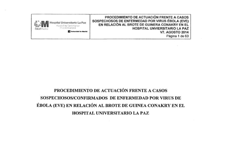 MADRID// La Consejería de Sanidad de Madrid ha proporcionado al personal sanitario del Hospital La Paz, dos días después de la primera infección, el procedimiento de actuación frente a casos sospechosos de ébola. Un documento que los trabajadores llevan exigiendo desde mayo. Hasta entonces, tan sólo se encontraban disponibles unas recomendaciones generales colgadas en la web del ministerio. El documento, al que ha tenido acceso La Marea, establece el protocolo de actuación específico del Hospital La Paz para el ébola da instrucciones sobre cómo ponerse y quitarse el traje en condiciones de seguridad.
