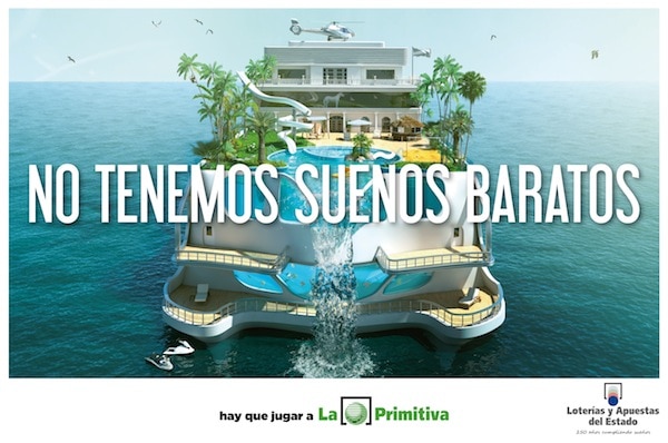 Seguro que le suena a usted, astuto lector, el eslogan que reza: “No tenemos sueños baratos”. Los creadores de esa campaña para un conocido sorteo de lotería con reminiscencias cavernícolas (La Primitiva) han decidido que ni usted ni yo soñamos con la paz mundial, con donar dinero para proyectos benéficos o simplemente para montar un negocio e intentar realizar una vocación. ¡No! Los creativos publicitarios de esa campaña piensan que usted y yo queremos lo típico: un yate, una motaza, un isla, un jet privado. Oiga, que yo quiero una vida sencilla y sosegada. Pasear al perro, quizá tener un pequeño huerto y poder disfrutar de un rato al día para leer… Pues no: tengo que desear una mansión con helipuerto. A los que han diseñado esta campaña les da igual que la desigualdad sea el gran reto del siglo XXI. Un dato que reconoce incluso el Foro de Davos. Pamplinas: usted quiere lo que todo el mundo: mansión, yate, isla, jet privado. Y a callar.
