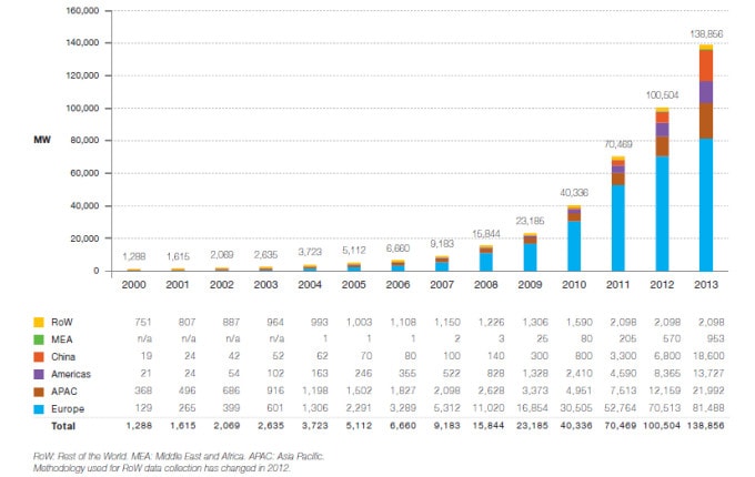 El número de instalaciones fotovoltaicas ha dejado de ser testimonial. A finales de 2013 había instalados más de 138 GW fotovoltaicos en todo el mundo, lo que es equivalente (en potencia) a unos 138 reactores nucleares. De estos, 4 GW están instalados en España, 18 en Italia y 36 en Alemania.