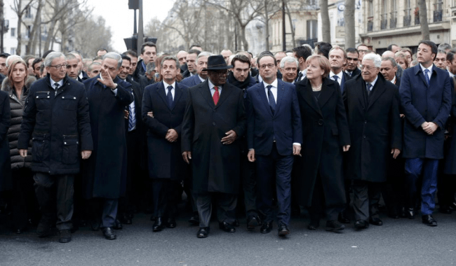 Si los supervivientes de Charlie Hebdo no hubieran sentido la responsabilidad de dedicar esta portada a combatir integrismos de todo tipo, no me cabe duda de que la hubieran dedicado a ilustrar el festival de hipocresía que a costa de su muerte se vivió durante estos días alcanzando el momento álgido con la llegada a París de los líderes mundiales. Y el dibujo hubiera sido bastante más duro que el de Felipe y Letizia follando por 2.500 euros. En la foto de familia de las autoridades encontrábamos rascando la superficie un catálogo de ataques a las libertades de prensa que iban del encarcelamiento de periodistas al cierre de diarios, pasando directamente por el asesinato por desvelar crímenes de estado. Más allá de este currículum de los amantes de la libertad, que sería la envidia de cualquiera que la odiara, los dirigentes que fueron Charlie Hebdo por un día ya han dejado de serlo oficialmente para empezar a lanzar globos sonda y saber hasta dónde se va a dejar violar la ciudadanía su libertad en nombre de esa misma libertad.