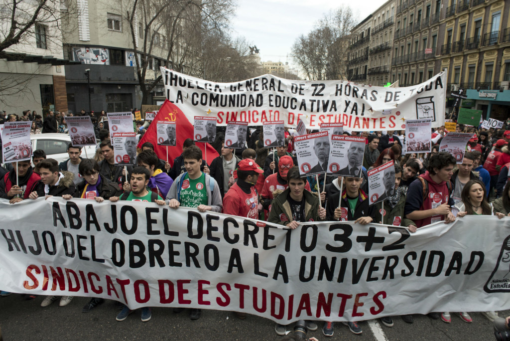 Entre el 75% y el 90% de los estudiantes de instituto y universidades, dependiendo de las comunidades autónomas, no ha acudido este jueves a clase en protesta por el rechazo de la nueva normativa que rebaja los grados a tres años, según ha valorado el Sindicato de Estudiantes sobre la segunda jornada del paro de 48 horas convocado contra el decreto 43/2015, conocido como el 3+2. A las protestas también se han sumado otros colectivos en lucha como el de afectados por la Hepatitis C y los trabajadores despedidos de la fábrica de Coca-Cola en Fuenlabrada. Más de un centenar de ciudades españolas han sido escenario de protestas.