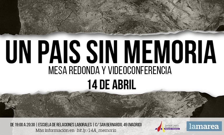 Este martes, 14 de abril, la Asociación para la Recuperación de la Memoria Histórica y La Marea organizan una mesa debate bajo el título Un país sin memoria, sobre los 130.000 desaparecidos durante el franquismo, cuyos familiares siguen aún hoy reclamando una justicia que se les niega. El acto tendrá lugar el martes a las 19:00 horas, en la Escuela de Relaciones Laborales (c/ San Bernardo 49, Noviciado) de Madrid.