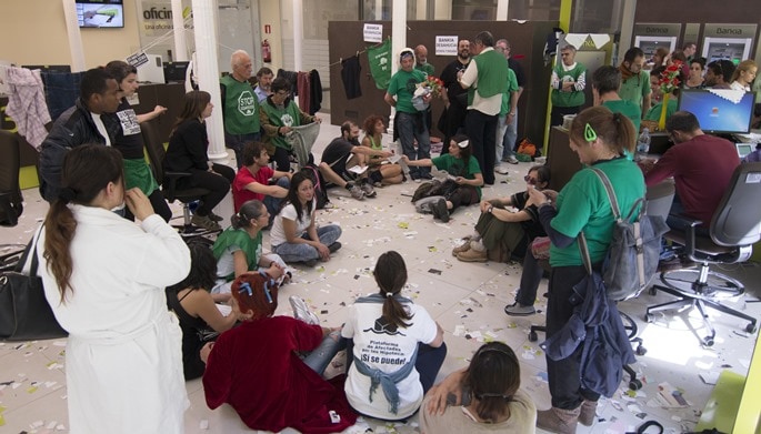 Bankia no tiembla en la Bolsa, pero sí en las calles. Bajo el lema “que tiemble Bankia”, tuvo lugar un encierro de 60 activistas de la Plataforma de Afectados por la Hipoteca en una sucursal de la entidad en Madrid. “Si Bankia es nuestra, sus sucursales también”, dijeron los activistas, que simularon el aspecto de una vivienda dentro de la sucursal e idearon un tendedero con ropa “porque los trapos sucios se tienden en casa, mi casa”, decía uno de los congregados. Con un ambiente festivo y combativo, se hicieron carreras de sillas, se colocó una tabla de planchar y varias pancartas reivindicativas. Finalmente, la UIP desalojó el local mientras los activistas hicieron desobediencia civil mediante resistencia pasiva. Por su parte, ese mismo día, el colectivo @15MpaRato acusó a Hacienda de obstaculizar la investigación de las tarjetas black.