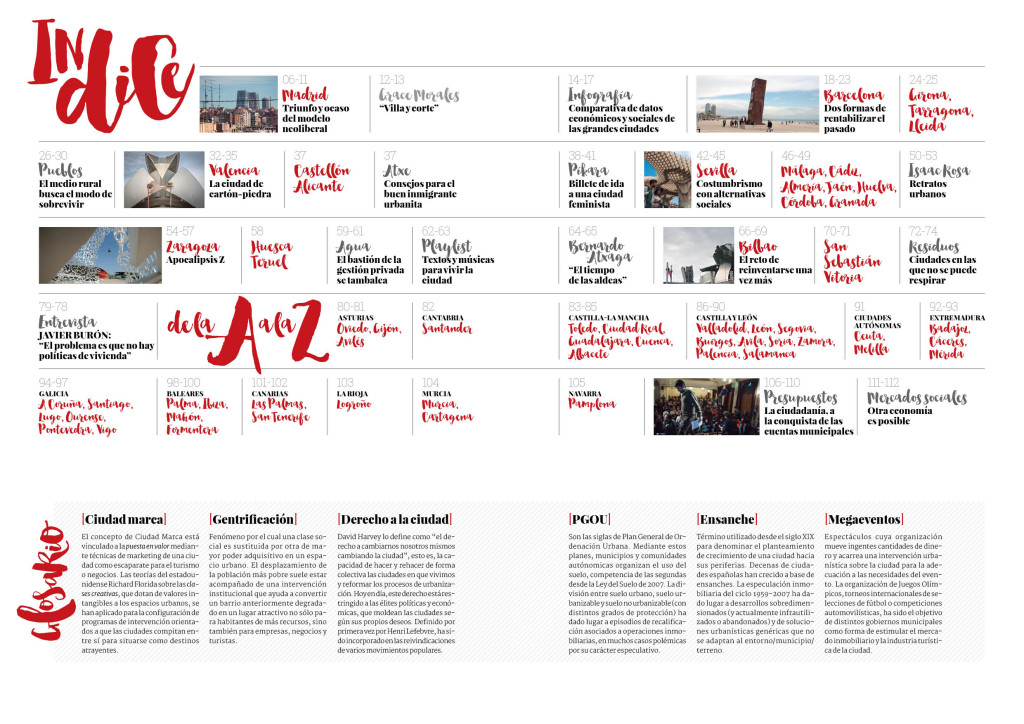El monográfico dedica una atención especial a algunas de las ciudades con más población: Madrid, Barcelona, Valencia, Sevilla, Zaragoza y Bilbao. Asimismo, cuenta con las firmas de Grace Morales, Bernardo Atxaga, Isaac Rosa, Miguel Brieva, Atxe y Henry Flowers. También con la colaboración especial de La Directa, Píkara Magazine y El Salmón Contracorriente.