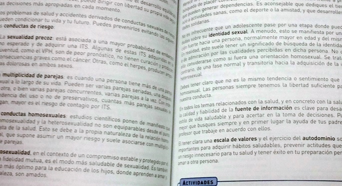 El tercero de los cuatro fascículos que componen el libro, destinado a adolescentes de entre 14 y 15 años, comienza el apartado sobre relaciones sexuales advirtiendo que algunos estilos de vida “influyen negativamente” y advierte que “los problemas de salud y accidentes derivados de conductas sexuales de riesgo pueden condicionar tu vida y tu futuro”. Estas actuaciones de riesgo serían la “sexualidad precoz”, la “multiplicidad de parejas” a lo largo de la vida y las “conductas homosexuales”.