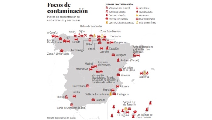 Como principal agente contaminante, el tráfico rodado. A distancia, pero con responsables mucho más delimitados, la industria y las centrales termoeléctricas de carbón y petróleo. Tan sólo diez de estas empresas emiten el 65% del dióxido de carbono en toda España, o lo que es lo mismo, 90 millones de toneladas anuales de este gas responsable del efecto invernadero, el principal causante del cambio climático. Asociadas a estas emisiones vienen las de otros agentes, mucho más dañinos para la salud, como el benceno, el azufre, el óxido de nitrógeno o las partículas PM10. Endesa se sitúa a la cabeza de las empresas más contaminantes. Le siguen Unión Fenosa-Gas Natural, Repsol e Iberdrola. Las poblaciones cercanas a industrias en Muskiz (Vizcaya), Aboño (Asturias) o As Pontes (A Coruña) sufren las consecuencias de la inadaptación de la industria a criterios de eficiencia y reducción de riesgos.