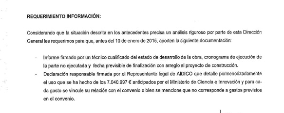 El Ministerio le pide que detalle de «forma pormenorizada el uso que se ha hecho de los 7.040.997 euros«. Por su parte, el informe de la administración concursal en el que se encuentra Aidico, señala que «el grado de ejecución del proyecto es del 55%, pese a que sólo se han presentado a justificación ante la Administración por parte de Aidico de 1.549.761,02 euros, lo que representa un grado de certificación del 30,74%». Del resto de dinero, nada se sabe.