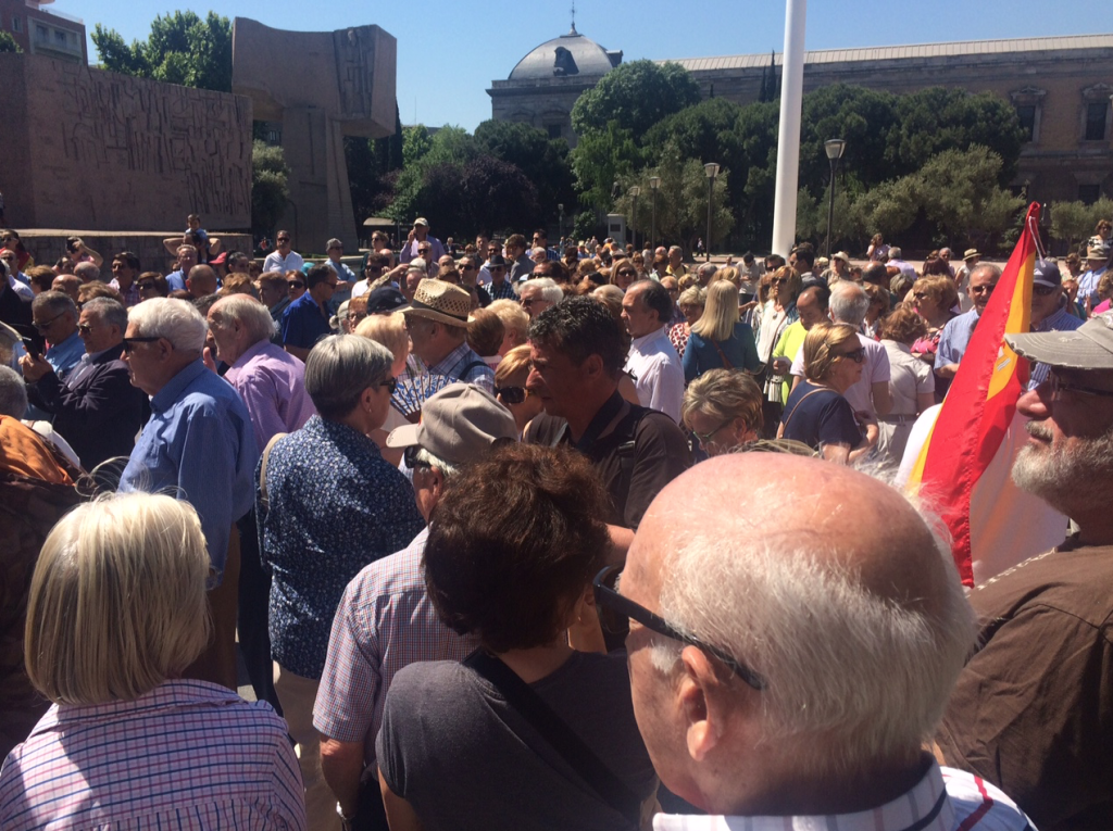 MADRID// Unas 200 personas acudieron este sábado a la Plaza de Colón en Madrid convocados por mensajes de whatsapp para impedir que «los comunistas» y Manuela Carmena lleguen a la alcaldía. Un grupo muy minoritario de personas enarbolando banderas españolas se han movilizado desde las doce de la mañana contra los resultados electorales que pueden llevar a la candidata de Ahora Madrid a gobernar la ciudad. Con gritos de «Pablo Iglesias a prisión y Carmena dimisión» los asistentes han dejado claro su posición en contra de Podemos y la posibilidad de que miembros de este partido o afines a él accedan a cargos de responsabilidad con el beneplácito del PSOE.