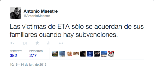 El mensaje fue el siguiente: “Las víctimas de ETA sólo se acuerdan de sus familiares cuando hay subvenciones”. Para asegurarme de que nadie pudiera acusarme de enaltecimiento del terrorismo u ofensa a las víctimas -los que tratamos con información conocemos lo cuidadoso que hay que ser con las afirmaciones-, enlacé un segundo tuit como respuesta a mi tuit original en el que hacía una rápida matización. Decía lo siguiente: Perdón, eran las del franquismo.