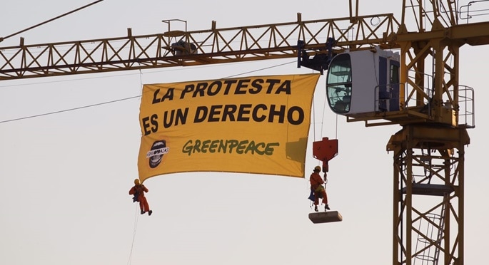 A partir de este miércoles, día 1 de julio, muchas de las acciones que habitualmente llevan a cabo organizaciones como Greenpeace pasarán a estar severamente penadas por la ley, que señala como infracciones determinadas formas de protesta pacífica como la que esta mañana está llevando a cabo la