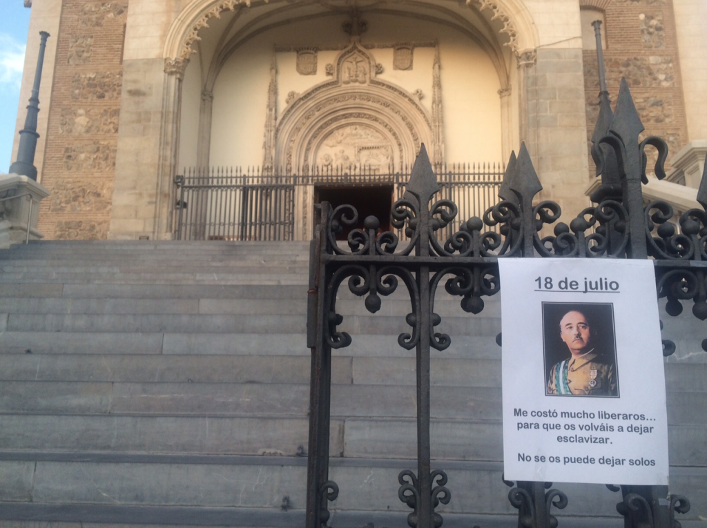 MADRID// En pleno centro de Madrid, en la Parroquia de los Jerónimos, se ha celebrado este sábado 18 de julio como cada año la misa fascista en honor de los «caídos por dios y por España» durante el golpe de Estado de 1936. A la celebración han acudido un centenar de personas, entre las que se encontraba Jose Luís Corral, líder del Movimiento Católico Español y el Nudo patriota Español, uno de los partidos integrantes de la coalición de extrema derecha La España En Marcha. Los asistentes han colocado unos carteles en el recinto de la Iglesia alabando el golpe de Estado y al dictador Francisco Franco.
