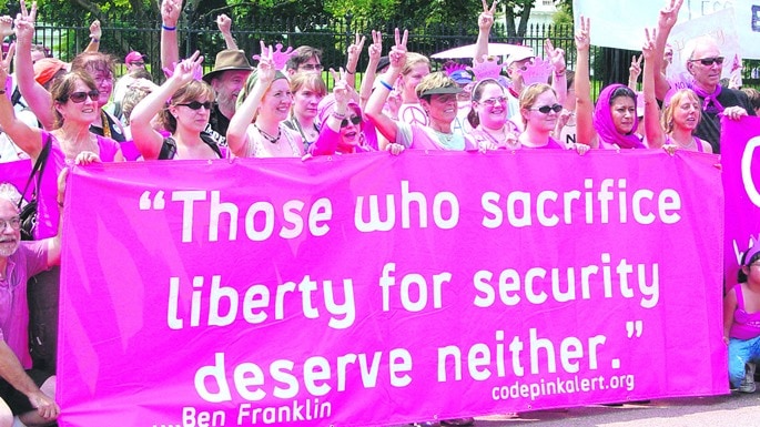 Desde hace ya unos cuantos años, se han multiplicado las acciones protagonizadas por mujeres para denunciar temas globales. Es el caso de Codepink (Código Rosa en inglés). Aunque en palabras de una de sus fundadoras, Medea Benjamin, «sí es verdad que podríamos ser definidas como un grupo feminista», sus acciones reclaman el pacifismo y el antimilitarismo. La organización se creó en 2002 para evitar que EEUU declarase la guerra a Irak. Siempre vestidas de rosa, sus performances por sorpresa en Bagdad captaron la atención de las decenas de cámaras extranjeras que seguían las ruedas de prensa previas a la invasión. Posteriormente, Codepink siguió defendiendo otras causas como el fin del apoyo estadounidense a la ocupación israelí de Palestina.