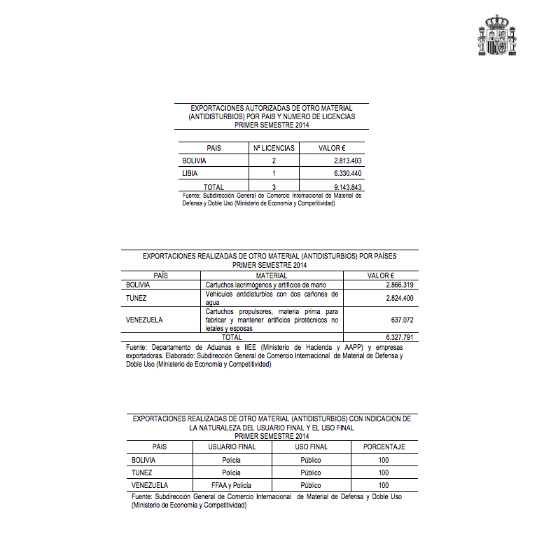 En una nota de prensa publicada el pasado mes de marzo, el Gobierno indicó que en el primer semestre de 2014 se había exportado a Venezuela material antidisturbios por valor de 637.072 euros, pero especificaba que todas las ventas se llevaron a cabo en el primer trimestre, antes de que entrara en vigor la suspensión promulgada por el Ejecutivo el 21 de marzo de 2014. Pero la publicación de este segundo documento por parte de la Secretaria de Estado de Comercio desmiente el argumento esgrimido por el Gobierno. El volumen de venta total de 1,5 millones de euros constata que en los meses siguientes a la entrada en vigor de la sanción las exportaciones continuaron, puesto que al cabo del año se vendió material antidisturbios al gobierno de Maduro por importe de 900.000 euros más.
