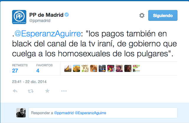 Esperanza Aguirre fue la paladín de los ataques contra Iglesias por sus “negocios” en la televisión iraní. La preocupación de la ex presidenta de Madrid por los homosexuales de este país ha sido constante desde la aparición de Podemos. Por ello, acusó a Iglesias de tener un programa en la cadena de un gobierno que cuelga a homosexuales desde las grúas. «Los pagos también en black del canal de la tv iraní, de gobierno que cuelga a los homosexuales de los pulgares”, añadió en otro tuit.