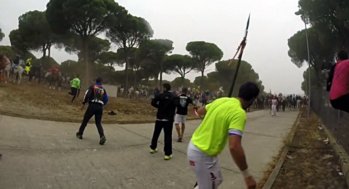 Veo a un jinete que intenta pasarnos por encima con el caballo, siento terror, otro vecino del pueblo le disuade, respiro. Gritamos que hay tradiciones que son aberraciones, que debería darles vergüenza hacer sufrir así a un animal, gritamos que no pararemos hasta la abolición. Empieza a llover y seguimos aguantando, la sed de sangre de los violentos se desata y empiezan a llover piedras. Se acercan al bloque, nos dan patadas, nos golpean con bastones, juraría que noto una lanza o algo punzante en el costado, pero no quiero mirar.