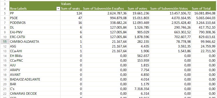Una de las mayores dificultades a la hora de realizar el cálculo ha sido cómo valorar las coaliciones, como en el caso de Podemos, o el PP con Foro, y los partidos vinculados, como es el caso del PSC en relación al PSOE, por ejemplo. Hemos decidido ofrecer dos datos distintos: las de los principales partidos con sus coaliciones asignadas y las de los mismos sin estas, para poder comparar con los presupuestos de campaña. Ninguna de las dos es la solución perfecta, la primera porque añade ayudas que no le corresponden del todo al partido y la segunda porque obvia gastos y ayudas que recibe por medio de esa coalición o partido asociado. Como no sabemos cúal es el reparto de gasto y subvenciones dentro de una coalición, la única opción posible para acercarnos lo más posible a la cifra concreta es dar ambos resultados: ofrecer la suma con las coaliciones nos permite dar una idea del impacto de sus resultados; y ofrecer el dato del partido sin añadidos nos permite comparar con sus presupuestos de campaña y saber cuánto dinero van a recibir.