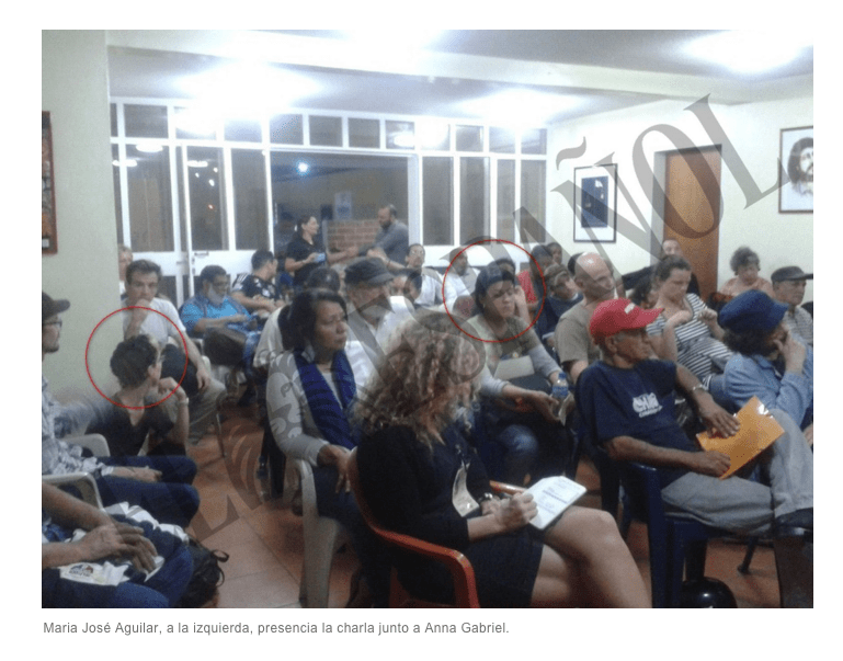 Maria José Aguilar en un comunicado ha explicado que ella jamás estuvo en el acto del que hablan en El Español y asegura que se encontraba ese día en una zona rural a dos horas de Caracas junto a otros intelectuales del foro internacional al que fue invitada, el acto al que asistió se llamaba “Territorio K-ribe”. En esta información del Observatorio Petrolero Sur se pueden ver diversas fotos en las que se distingue sin el más mínimo genero de duda a la profesora Maria José Aguilar.