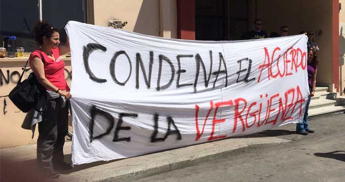 A cambio de la esperada entrevista, Alba, una compi de nuestra brigada, fue retenida en una comisaría griega durante tres horas con otras tres españolas y una chica búlgara. Recibieron un trato correcto aunque intolerablemente machista por parte de los agentes. A cambio de unos minutos de atención del papa, la Policía nos «rodeó» a Sofía, Cristina y a mí cuando en el puerto de Mitilene sacamos una pancarta donde le pedíamos a Francisco que condenara el acuerdo de la vergüenza entre la UE y Turquía.