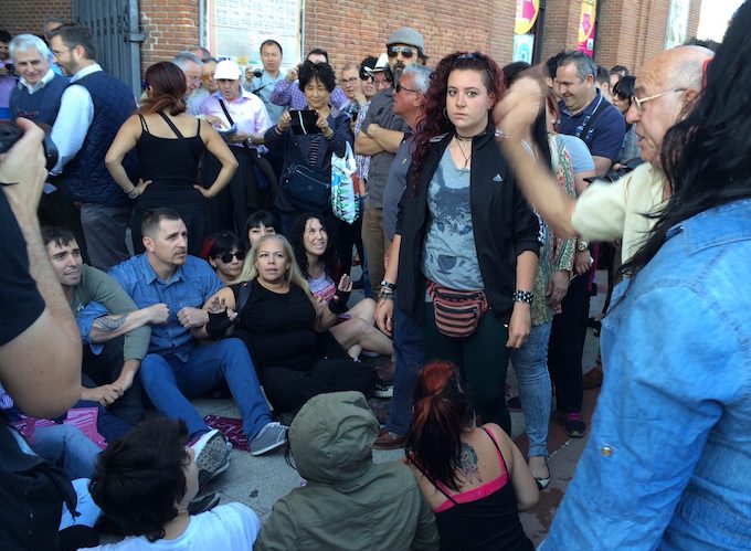 La protesta arrancó en torno a las 18.30 de la tarde. Con las inmediaciones de la plaza atestadas de aficionados a la tauromaquia, el grupo hizo una sentada en la puerta, lo que atrajo la atención de la gente. «Guarros», «maricones», «arriba España» o «sí a los toros» fueron algunos de los gritos que recibieron los activistas, a quienes también arrojaron objetos. se alternaban con una lluvia de objetos sobre los activistas. Varios de ellos intentaron contener la marea de aficionados enfurecidos.